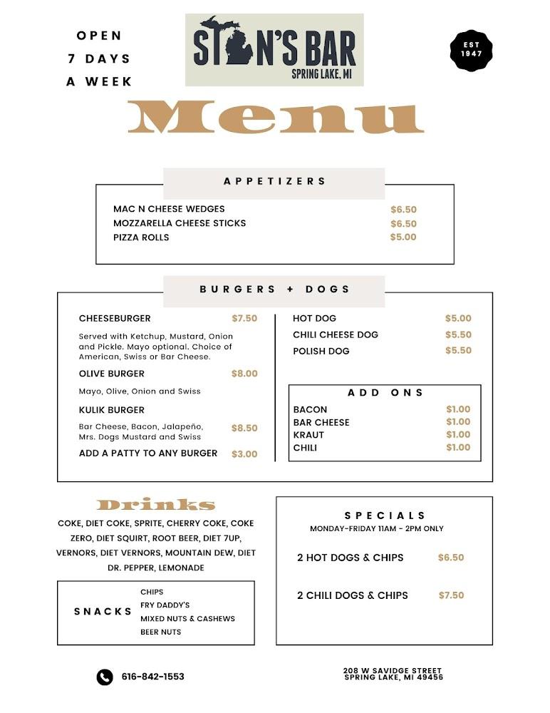 Welcome to Stan's Bar, your cozy hometown spot in Spring Lake, MI. With a relaxed ambiance, it’s the perfect place to unwind over delicious burgers, hot dogs, and tasty appetizers. Enjoy a remarkable selection of 17 beers on tap, alongside excellent cocktails, while you play Keno or test your luck with pull tabs. Our jukebox sets the stage for a vibrant atmosphere, making it ideal for solo lunches or evening gatherings. We offer dine-in, takeout, and delivery options, ensuring a great experience for all. Visit us at 208 W Savidge St and discover your new favorite local hangout!